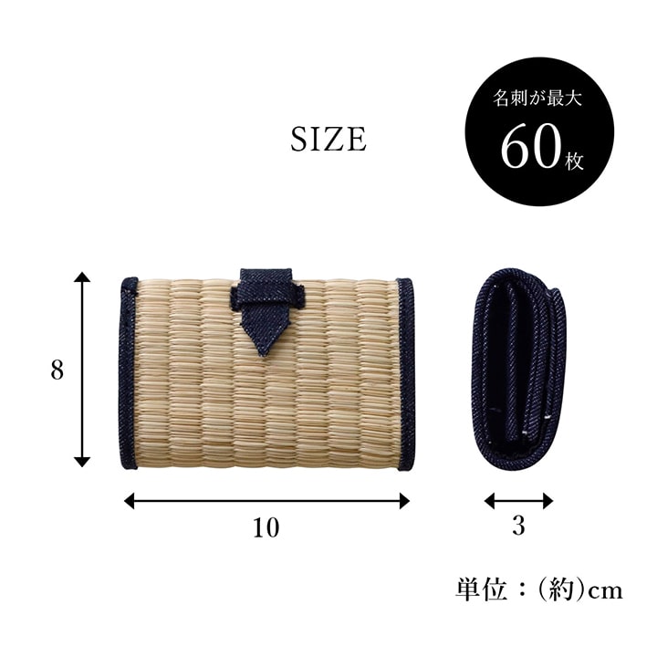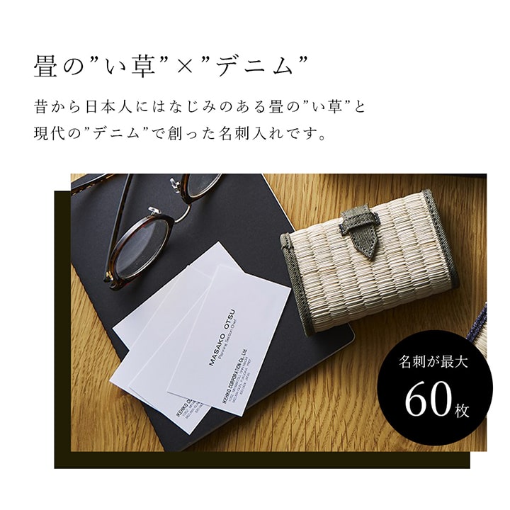 ■ 国内の老舗デニムメーカー「カイハラデニム」×イケヒコ・コーポレーションのコラボ商品。 ■ ヘリにデニムの生地を使用し、い草部分はざっくりとした質感の七島い草を使用しました。 ■ メイン収納は2つに分かれていて、各30枚ずつ、最大60枚程度の名刺が入るたっぷりサイズです。 ■ カードポケットが1箇所ついているので、ICカードを入れて定期ケースとしても便利です。 ※ 画面上のカラーはご使用ブラウザやモニターの設定により、実物とは若干異なる場合がございます。 ※ 天然素材の特性上、色や風合いに多少の誤差が生じる場合がございます。 |