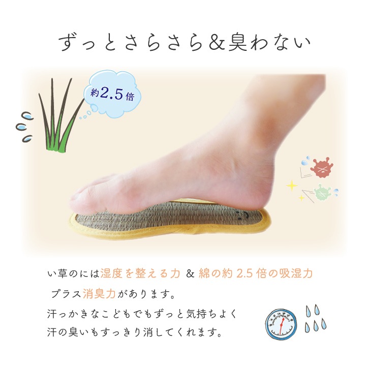 ■ い草でできた消臭&ムレにくいインソール。 ■ 裸足で靴を履くこどもたちの足のニオイを軽減してくれます。 ■ い草の調湿力と吸湿力で足裏サラサラ快適です。 ■ かかとにあるにっこりマークの刺繍もかわいい印象を与えてくれます。 ※ 掲載写真は表記サイズと異なる場合がございます。 ※ 画面上のカラーはご使用ブラウザやモニターの設定により、実物とは若干異なる場合がございます。あらかじめご了承の上、ご注文をお願いいたします。 |