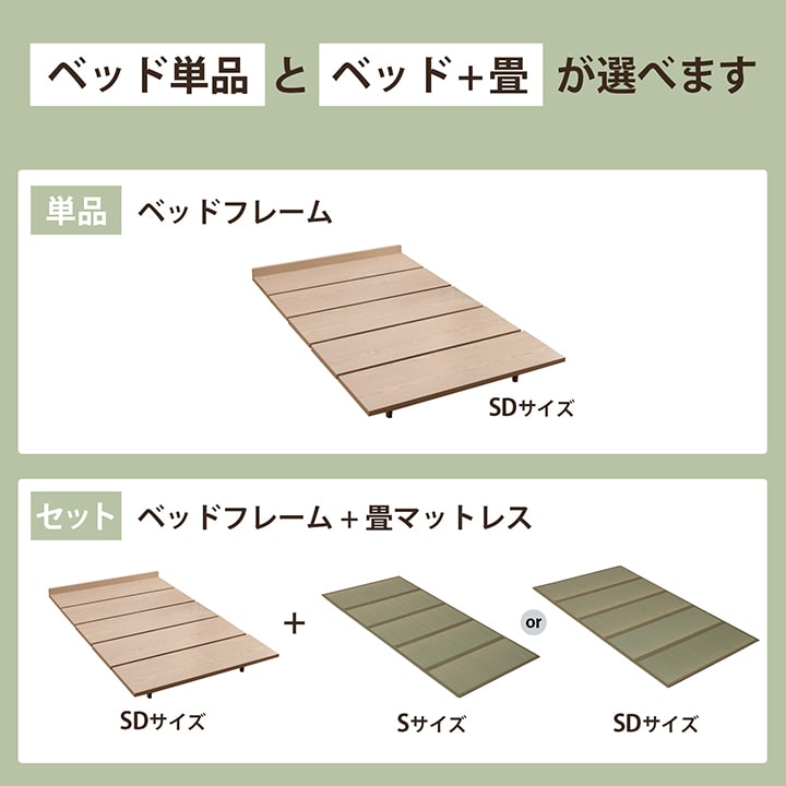 | セット内容 | 単品:ベッドのみ シングルセット:ベッド + 夢見畳シングル セミダブルセット:ベッド + 夢見畳セミダブル |