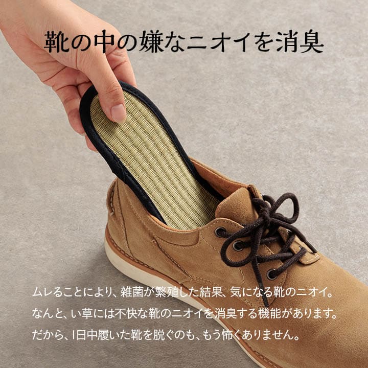 | ■純国産のい草を使用したインソールです。靴の中敷としてお使いください。 ■い草には、湿度を吸収する効果があるので、靴の中のムレを吸収します。また消臭効果もあるので、不快なニオイを吸着します。 ■い草にはほどよいクッション性がありますので、心地よい踏み心地です。 ■国産のい草は繊維がしっかりとつまっていますので、海外のい草に比べ、摩擦に強く耐久性があります。 ※商品の特性上、開封後のお客様都合による返品はお受けいたしかねます。予めご了承くださいませ。 |
