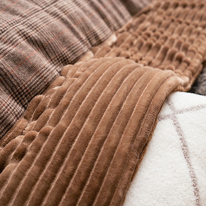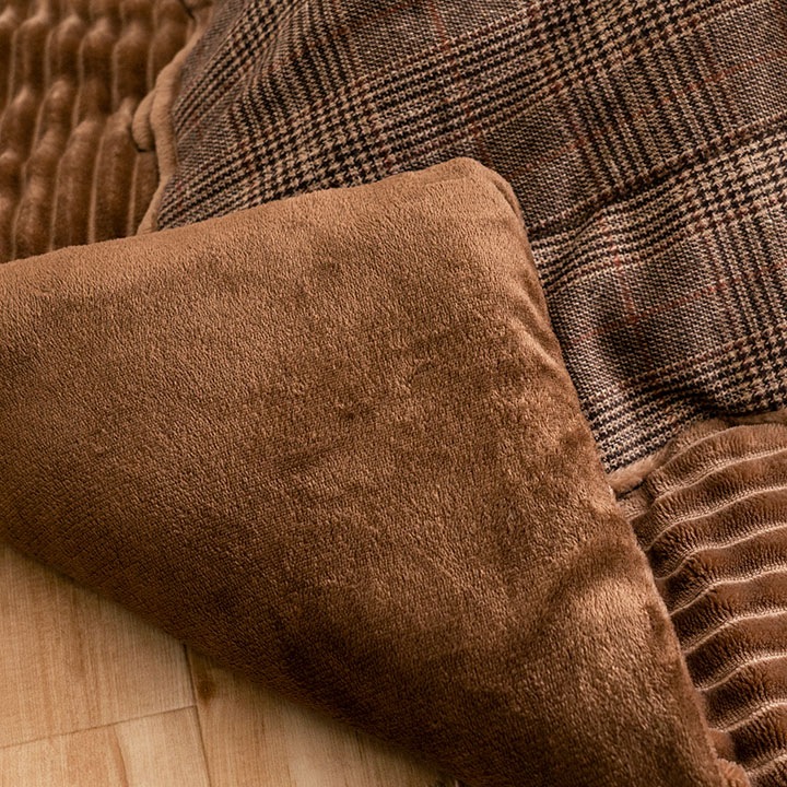 | 組成 | 表地:ポリエステル80%、アクリル20%、レーヨン・ナイロン・毛・綿・ポリウレタン20%先染め / 裏地:ポリエステル100%フランネル / 中材:ポリエステル100% |