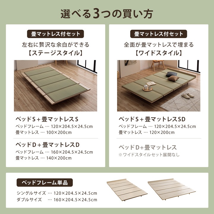 | セット内容 | 単品:ベッドのみ シングルセット:ベッド + 夢見畳シングル セミダブルセット:ベッド + 夢見畳セミダブル |