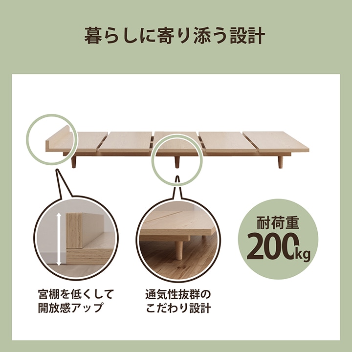 ■お部屋を広く見せるロースタイルベッド ■余白を生かしたワイドなサイズ感 ■ステージ部分はサイドテーブルとして活用可能 ■通気性抜群の設計 ■脚を外して使用することもできます。 ■安心の耐荷重200kg ※ 画面上のカラーはご使用ブラウザやモニターの設定により、実物とは若干異なる場合がございます。あらかじめご了承の上、ご注文をお願いいたします。 |