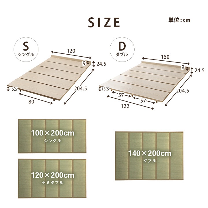 | サイズ | ベッド:120×204.5×23.9cm 夢見畳シングル:100×210cm 夢見畳セミダブル:120×210cm |